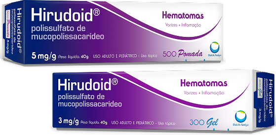 Todas as apresentações de Hirudoid® são indicadas para hematomas, dores* e inflamações após pancadas, e também para auxiliar nos sintomas causados pelas varizes.² No entanto, Hirudoid® Pomada pode ser usado em feridas abertas.²Hirudoid® Gel não deve ser usado em feridas abertas pois contém álcool.²